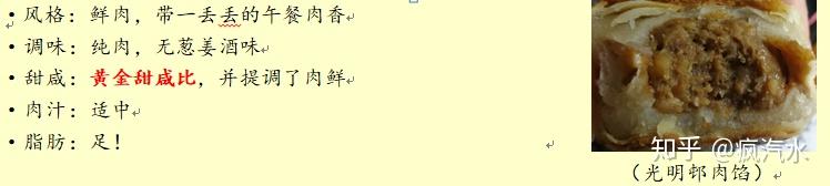 这项指标是鲜肉月饼的灵魂,评价指标包括肉香、汁水丰盈度、脂肪感和甜咸比。其中,肉香是灵魂中的灵魂。虽然大家都说鲜肉月饼的肉馅不就是生煎嘛,但生煎也有好与差的分别啊。好的肉香会散发鲜肉的本身的味道,不会有肉夹气,也不必用太多的葱姜黄酒掩盖其腥味。若能在此基础上加上一些适当的肉汁丰富口感和脂肪香(就是大家熟知的猪油香),就是一个上乘的肉馅儿。