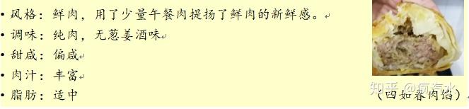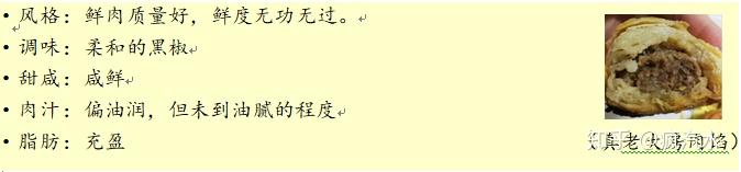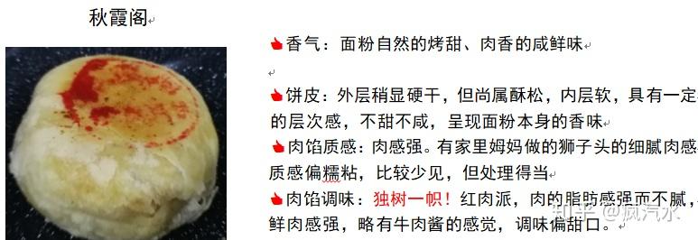 秋霞阁饼皮和松饼派类似,两面烘的肉馅质感的评价指标主要有:肉馅量、肉馅质感(包括肉感真实度、软硬、松紧、粘糯/Q弹、颗粒大小、爽滑/粗糙)。