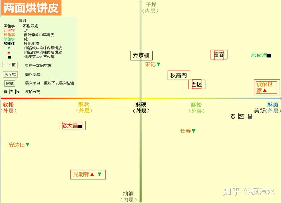 因此两面烘派的饼皮,评价指标分为内外两层。外层(横坐标)依次划分为软糯、酥软、酥硬、酥松和酥脆;内层由于都偏柔软,因此软度不细分,主要评价油润度(纵坐标)对内层口感的影响。