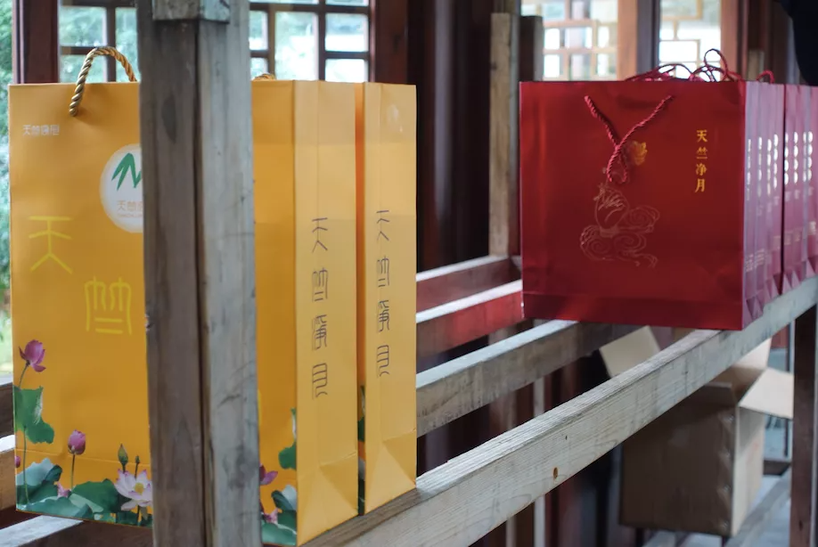 我去年去的时候正好有当地人过来买粽子,而且一买就是好几十盒的礼纸盒装,可见素粽子的火爆了。礼纸盒装里除了粽子除了一罐僧人们后院种的茶。一口粽子一口茶,解腻。