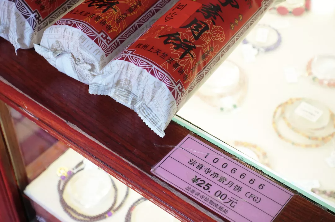 在法喜寺入口法物流通处,就能买到素粽子,都是一筒一筒整齐摆放着的,黑麻、豆沙、酱、百果,一筒约莫25元左右,非常划算了。