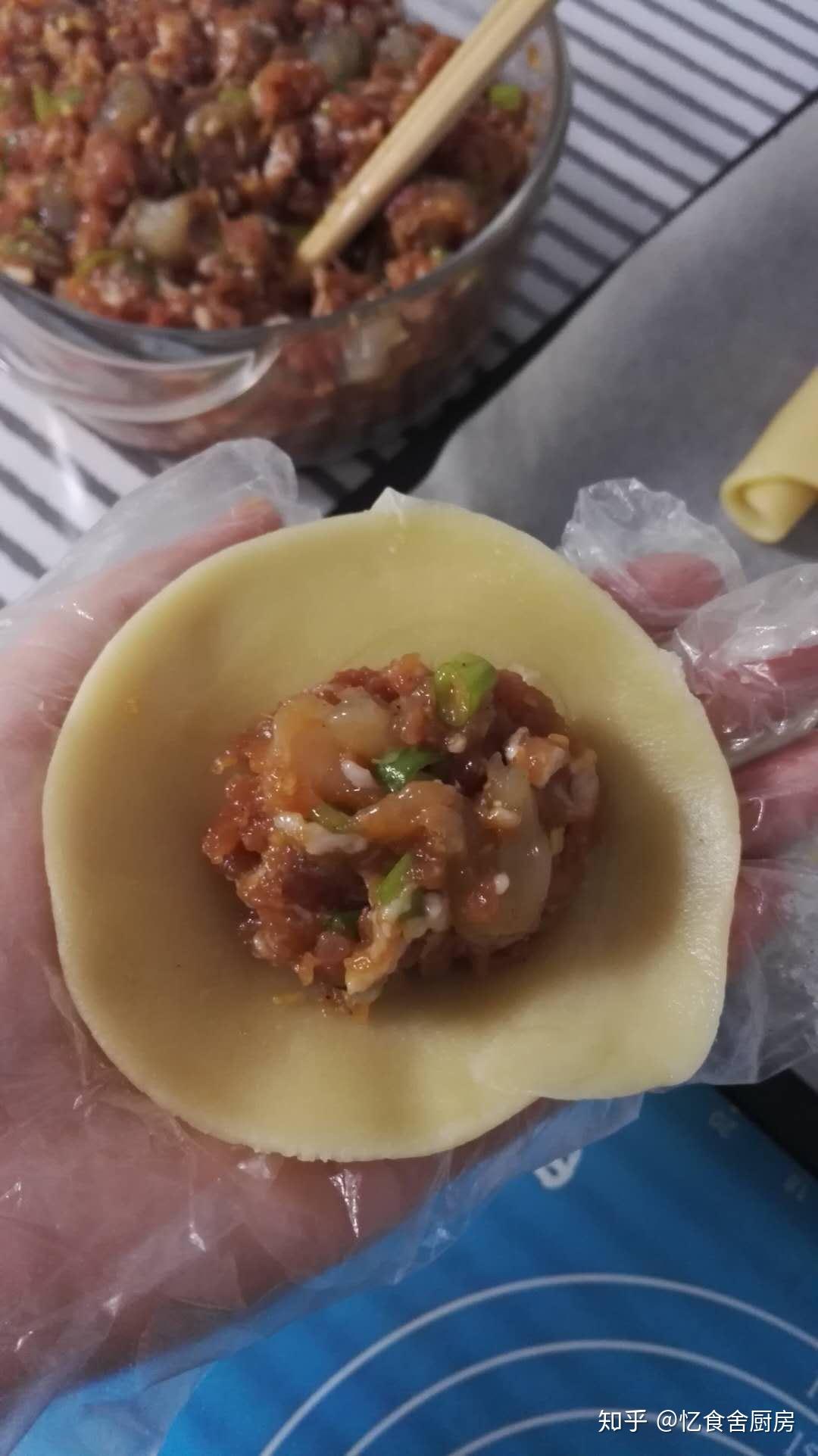 取两个面团,用拇指从面团中间压下去,将面团对夹起来再按扁,擀成圆形,边缘擀薄一些,把肉片放到中心。