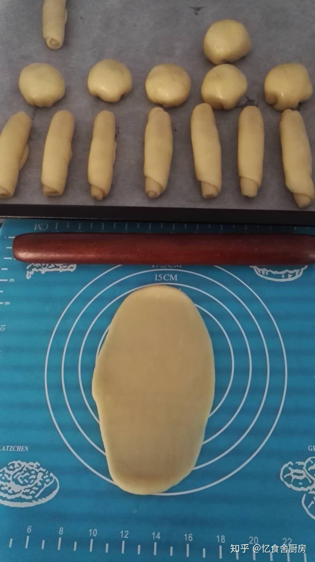 20分钟后取两个面团擀开,擀成长椭圆形。