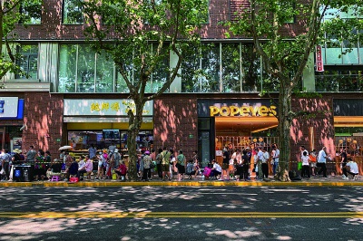 前几天,淮海中路上荣光邨门前买花生粽子的长龙一路排到了“泡泡眼”(Popeyes)。